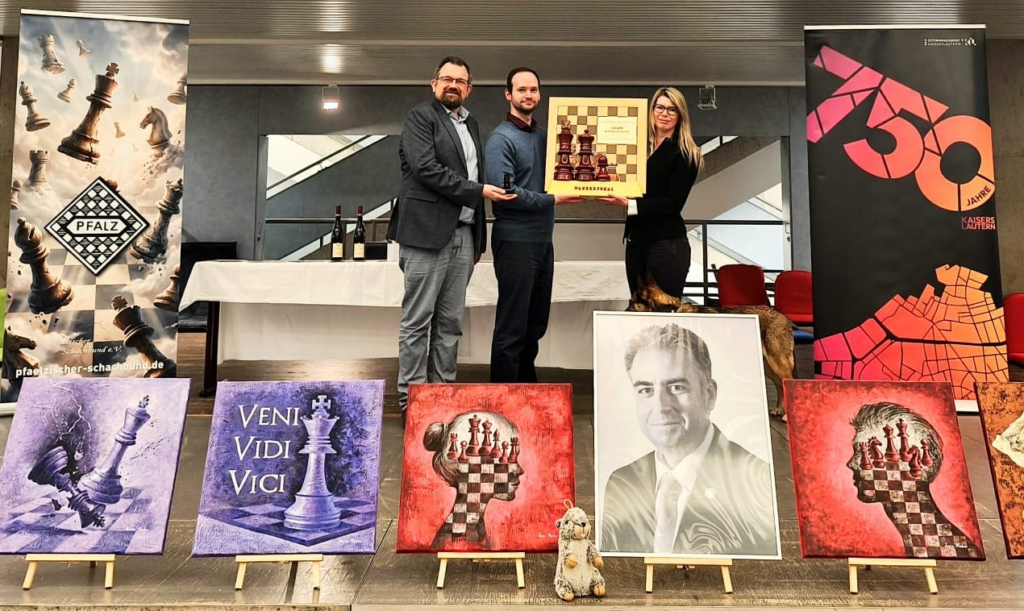 Bei der Siegerehrung übergab Sandra Schmidt den Pokal zusammen mit Schäferhund Bella an den Pfälzischen Meister im Schnellschach 2026 Martin Heider.